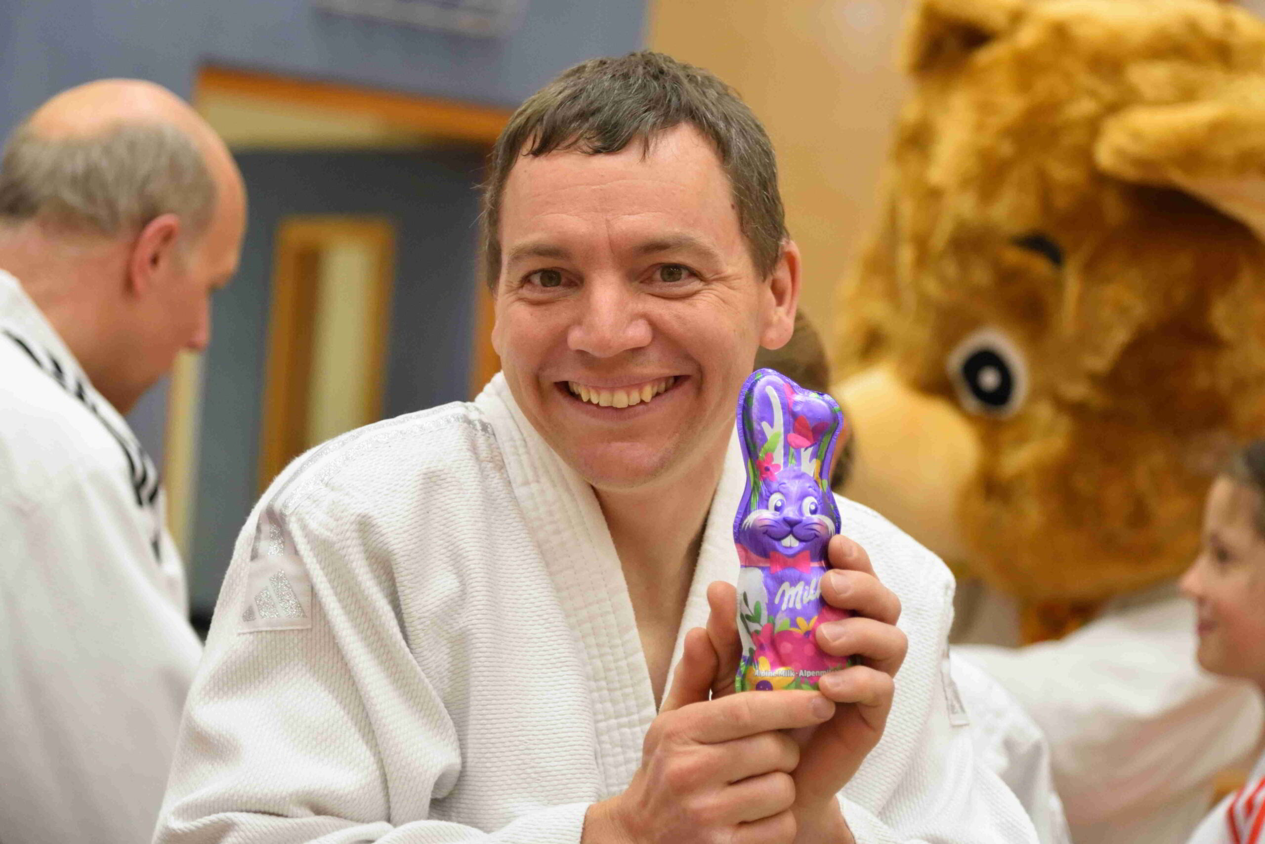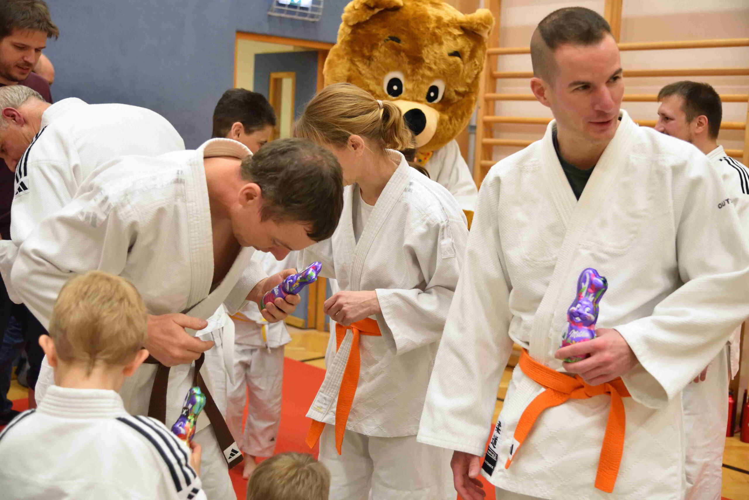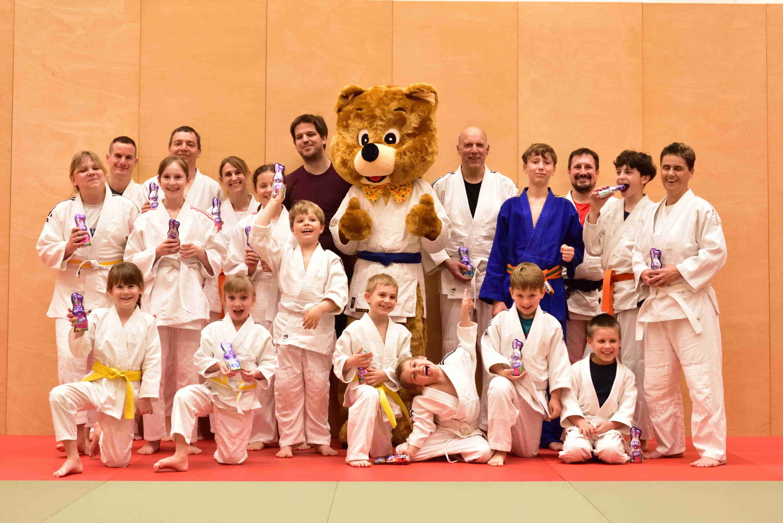 Doch das Highlight des Tages kam auf leisen Tatzen: Kuma, unser Vereinsmaskottchen, schaute persönlich vorbei! Mit seinem breiten Bärenlächeln sorgte er sofort für strahlende Gesichter – und er kam nicht mit leeren Pfoten. Für jede und jeden hatte er eine kleine Osterüberraschung dabei, die natürlich mit Begeisterung entgegengenommen wurde.
